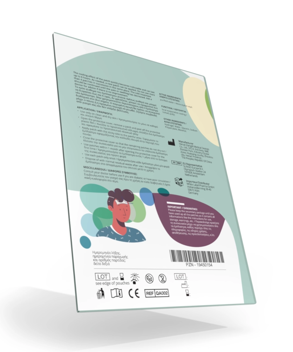 | Sicherheitshinweis | Nur zur äußeren Anwendung. Nicht auf verletzter oder gereizter Haut oder zusammen mit anderen Hautprodukten (auch nicht mit Medikamenten, die in die Haut eingerieben werden) anwenden. Verwenden Sie nicht mehr als 4 Pflaster nacheinander auf derselben Stelle. Nicht verwenden, wenn Sie eine Allergie gegen Heftpflaster haben. Brechen Sie die Anwendung des Pflasters sofort ab, wenn Sie einen Ausschlag, Hautreizungen oder andere unerwünschte Wirkungen feststellen. Nicht auf oder in der Nähe der Augen verwenden. Die Verwendung bei Kindern muss unbedingt von Erwachsenen beaufsichtigt werden. Nicht bei Kleinkindern oder Personen anwenden, die das Pflaster nicht selbst entfernen können. Konsultieren Sie vor der Anwendung Ihren Arzt, wenn Sie Diabetiker sind, Probleme mit dem Kreislauf haben, an einer Hautkrankheit leiden oder wenn Sie starke Schmerzen oder zusätzliche Verletzungen haben. Wenn Sie schwanger sind, sollten Sie die Verwendung des kühlenden Schmerzpflasters vorab mit Ihrem Arzt abklären. Suchen Sie einen Arzt auf, wenn die Symptome anhalten. |